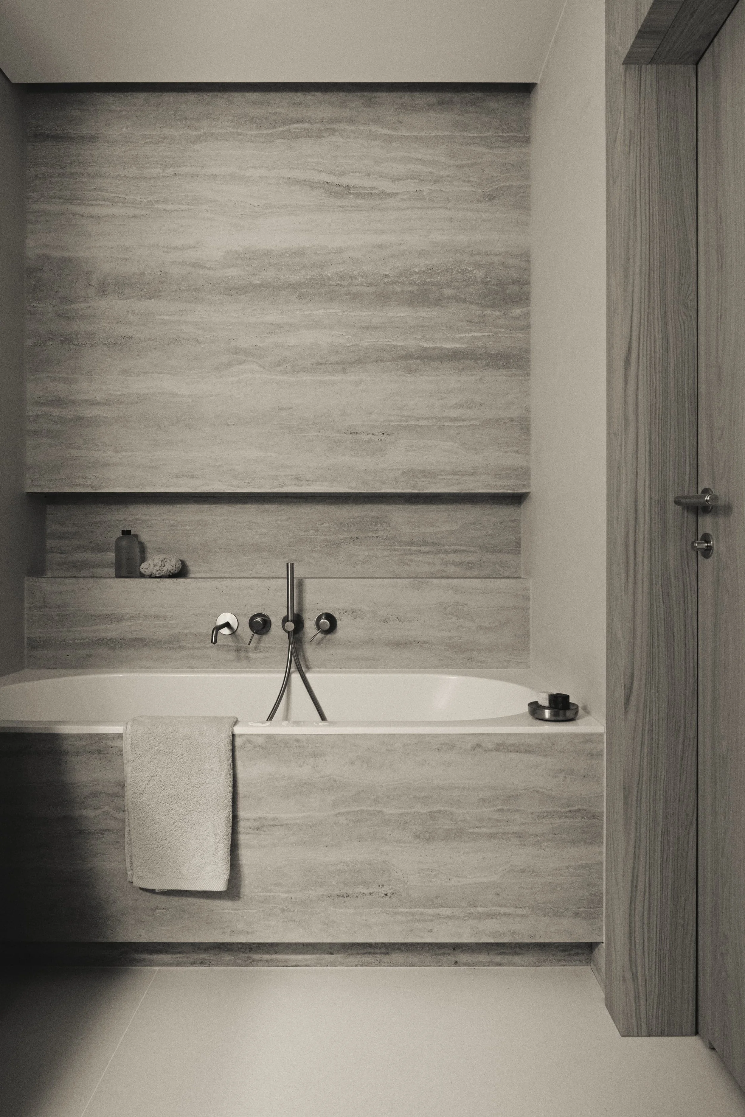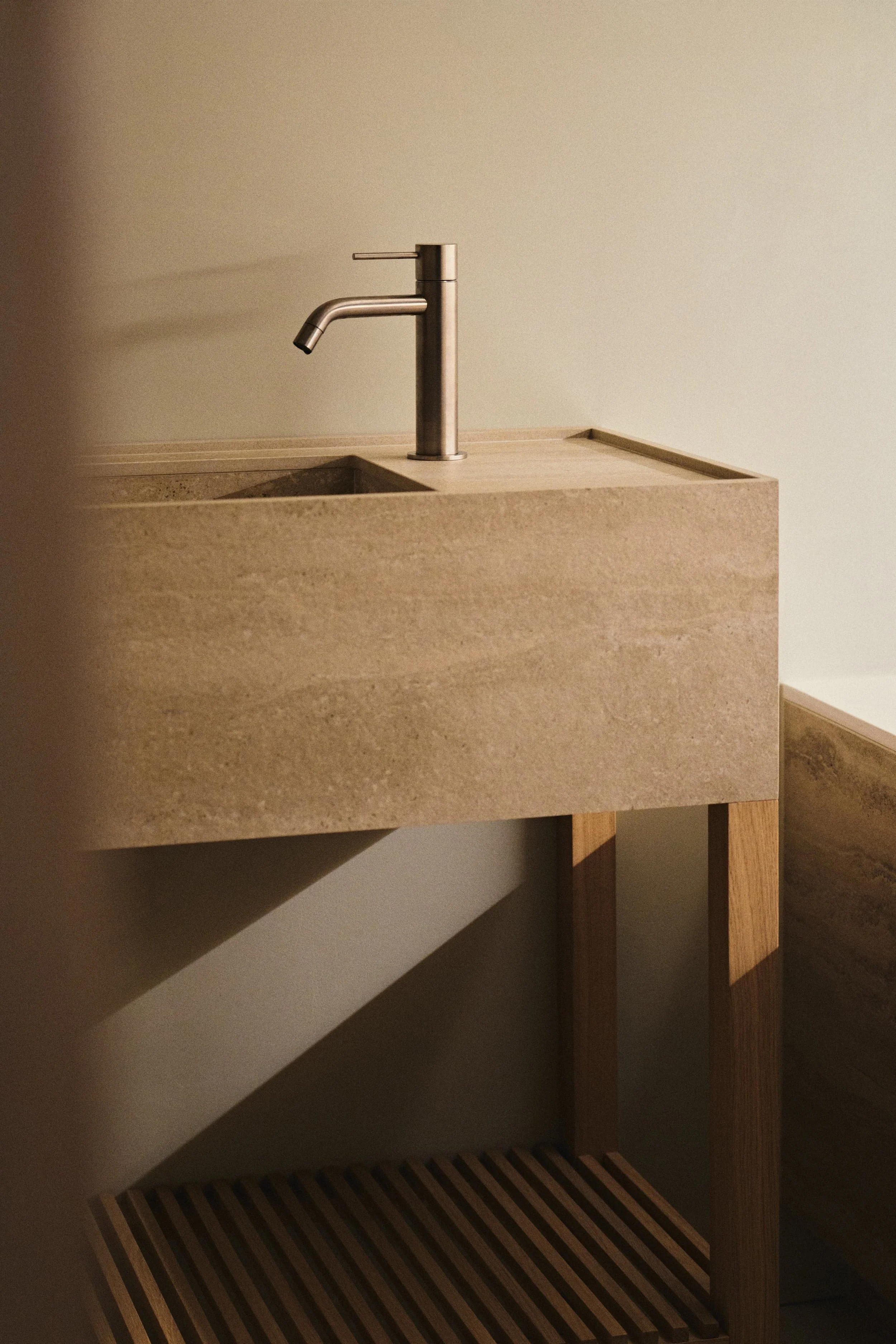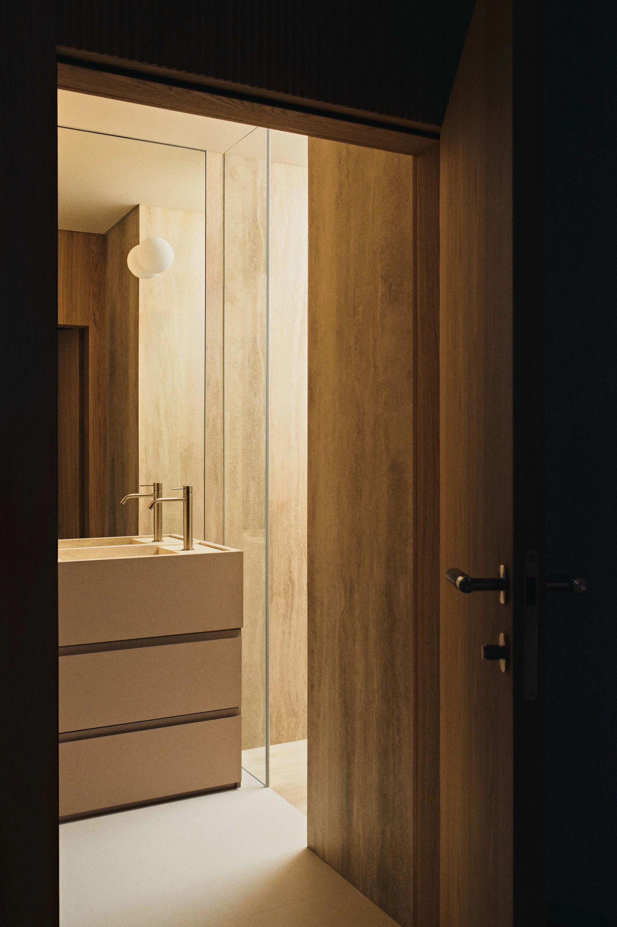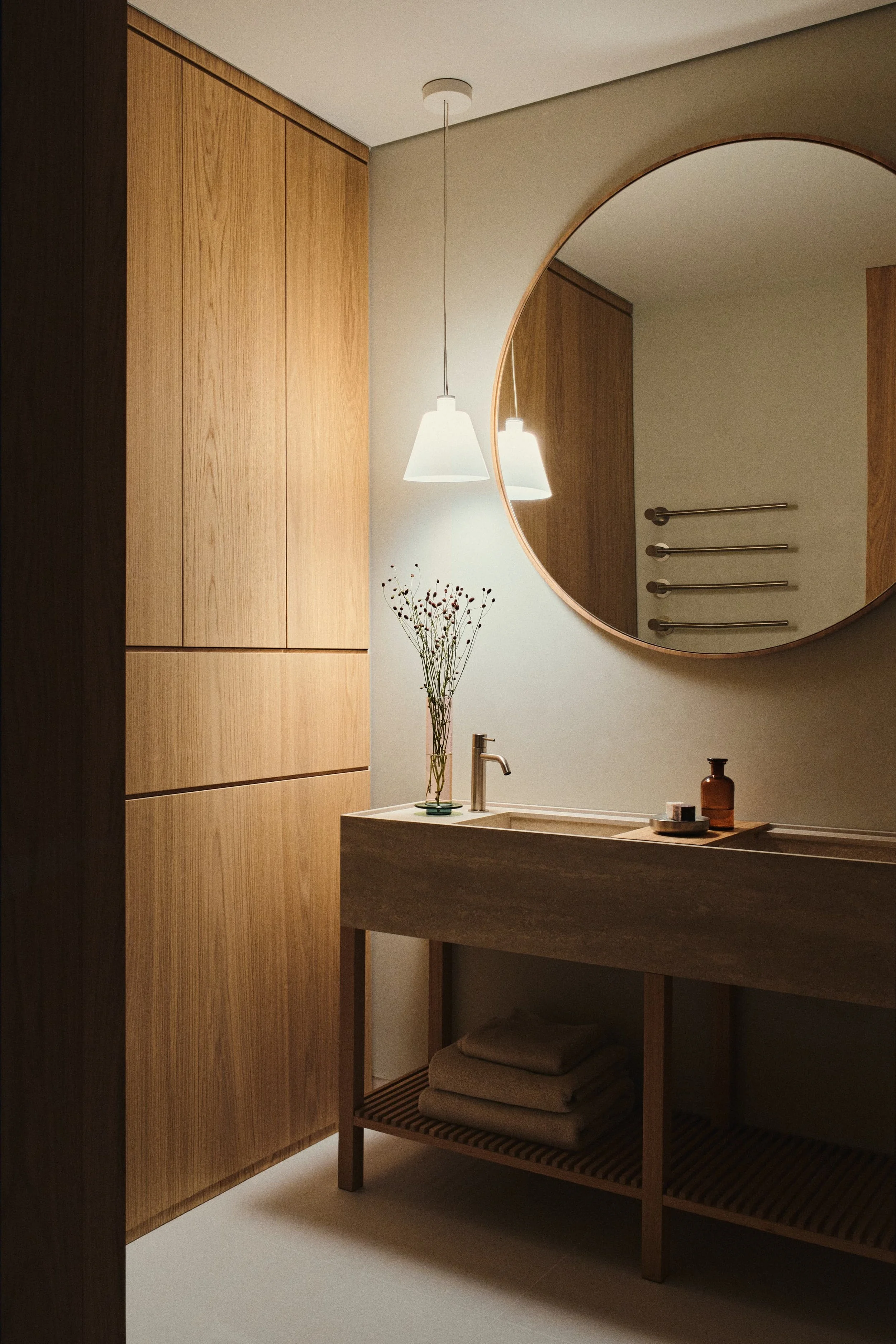 Aranżacja łazienek opiera się świadomej redukcji formy i harmonijnym dialogu kamienia i drewna. Masywna, kamienna bryła umywalki o prostych krawędziach, zestawiona została z lekką, dębową konstrukcją pomocniczą. Okrągłe lustro oraz minimalistyczna armatura ścienna w stalowym wykończeniu wprowadzają subtelny kontrapunkt dla surowości kamienia.