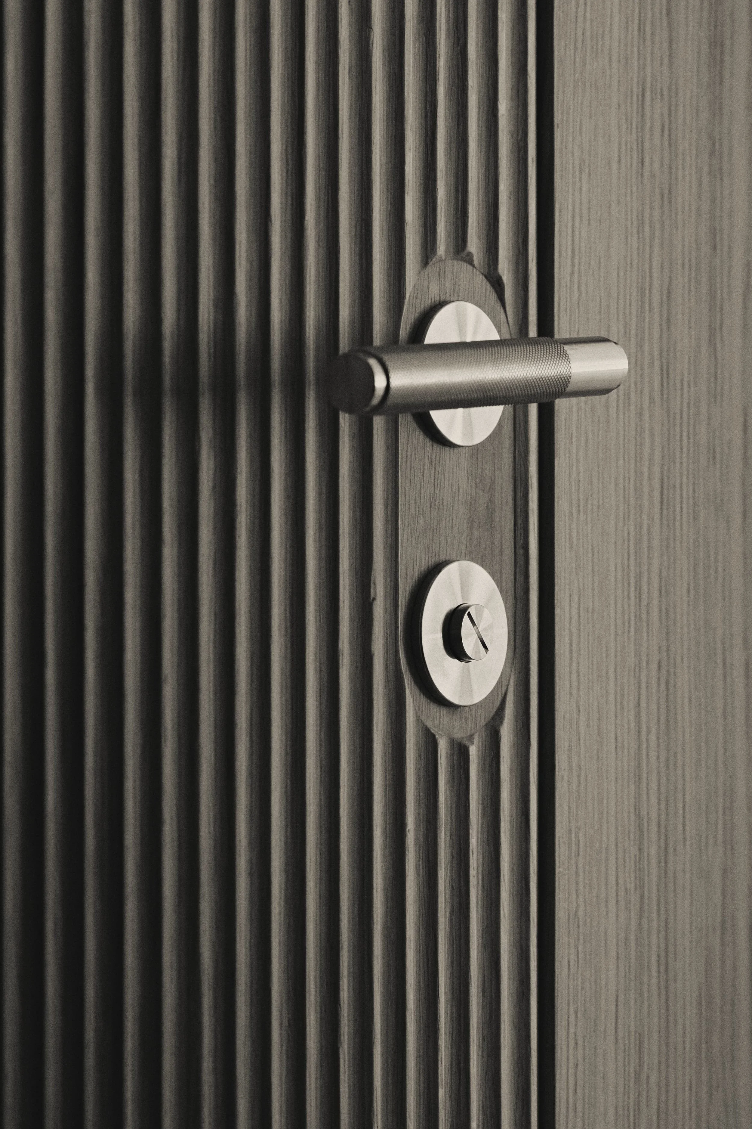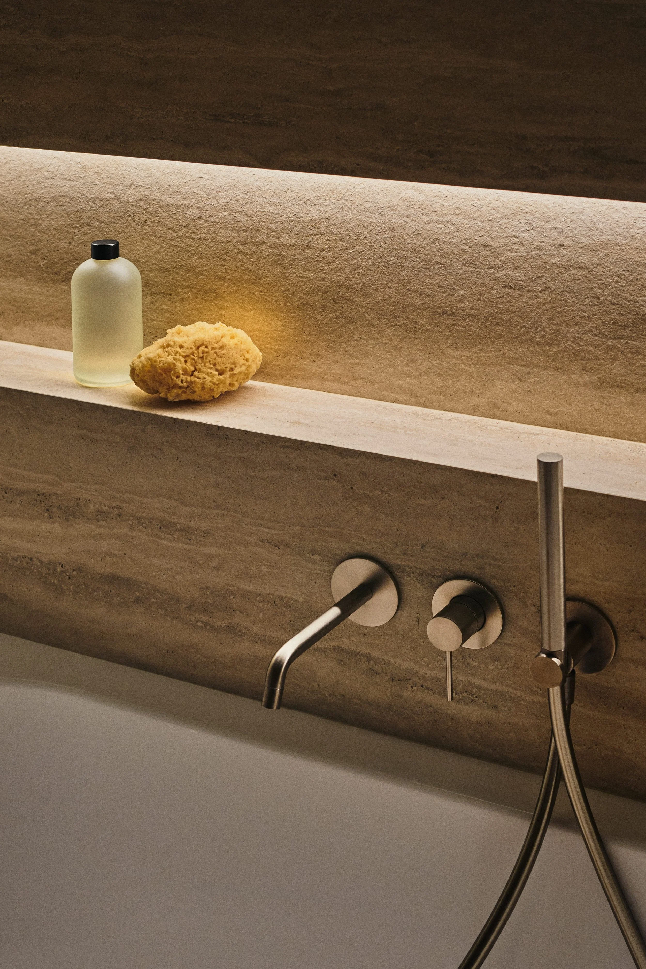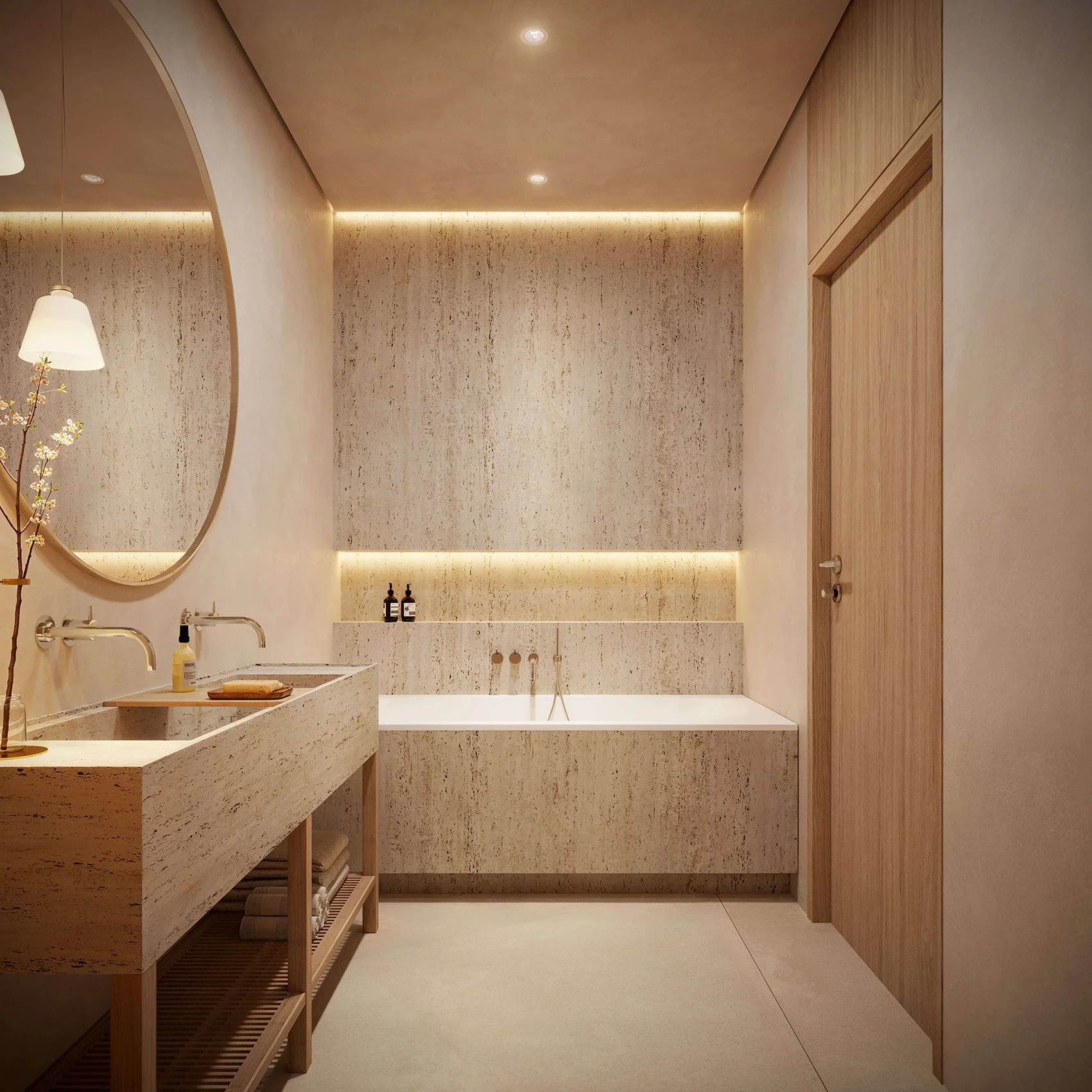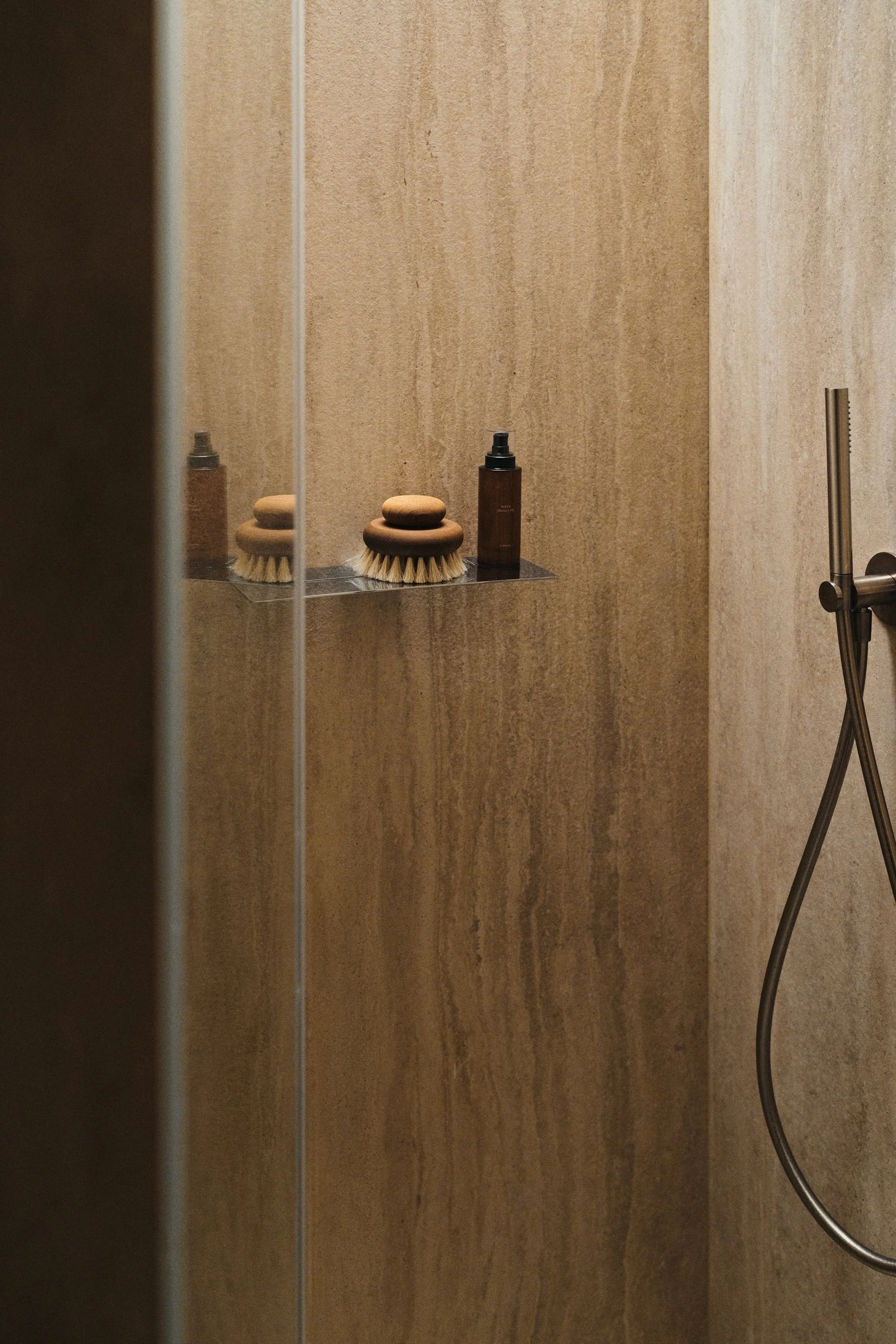 Aranżacja łazienek opiera się świadomej redukcji formy i harmonijnym dialogu kamienia i drewna. Masywna, kamienna bryła umywalki o prostych krawędziach, zestawiona została z lekką, dębową konstrukcją pomocniczą. Okrągłe lustro oraz minimalistyczna armatura ścienna w stalowym wykończeniu wprowadzają subtelny kontrapunkt dla surowości kamienia.
