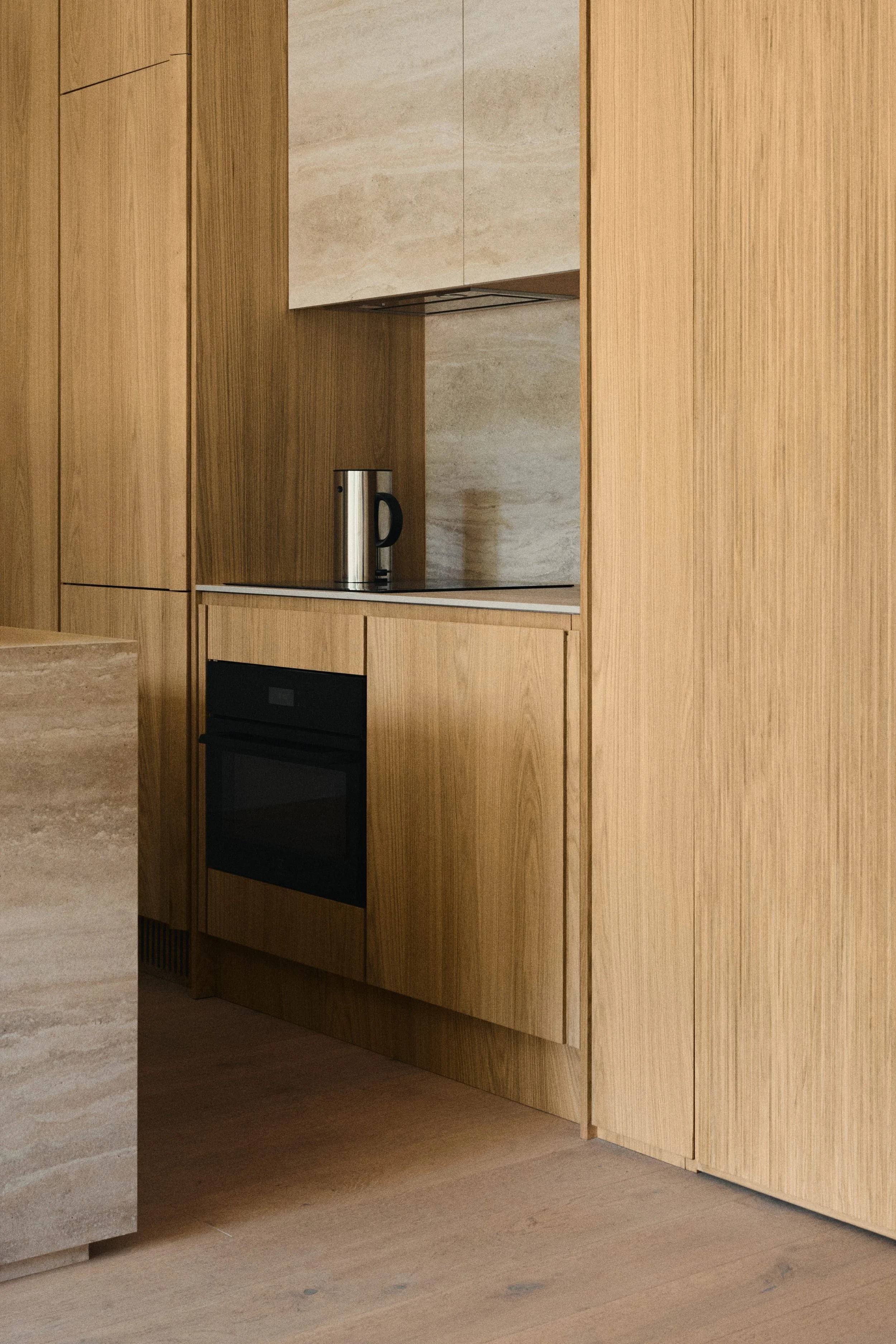 Dominującym elementem apartamentu jest zabudowa stolarska wykonana z pionowo usłojonego jasnego dębu. Centralną część kompozycji stanowi wyspa kuchenna i wnęka robocza wykończona trawertynem o subtelnym rysunku.