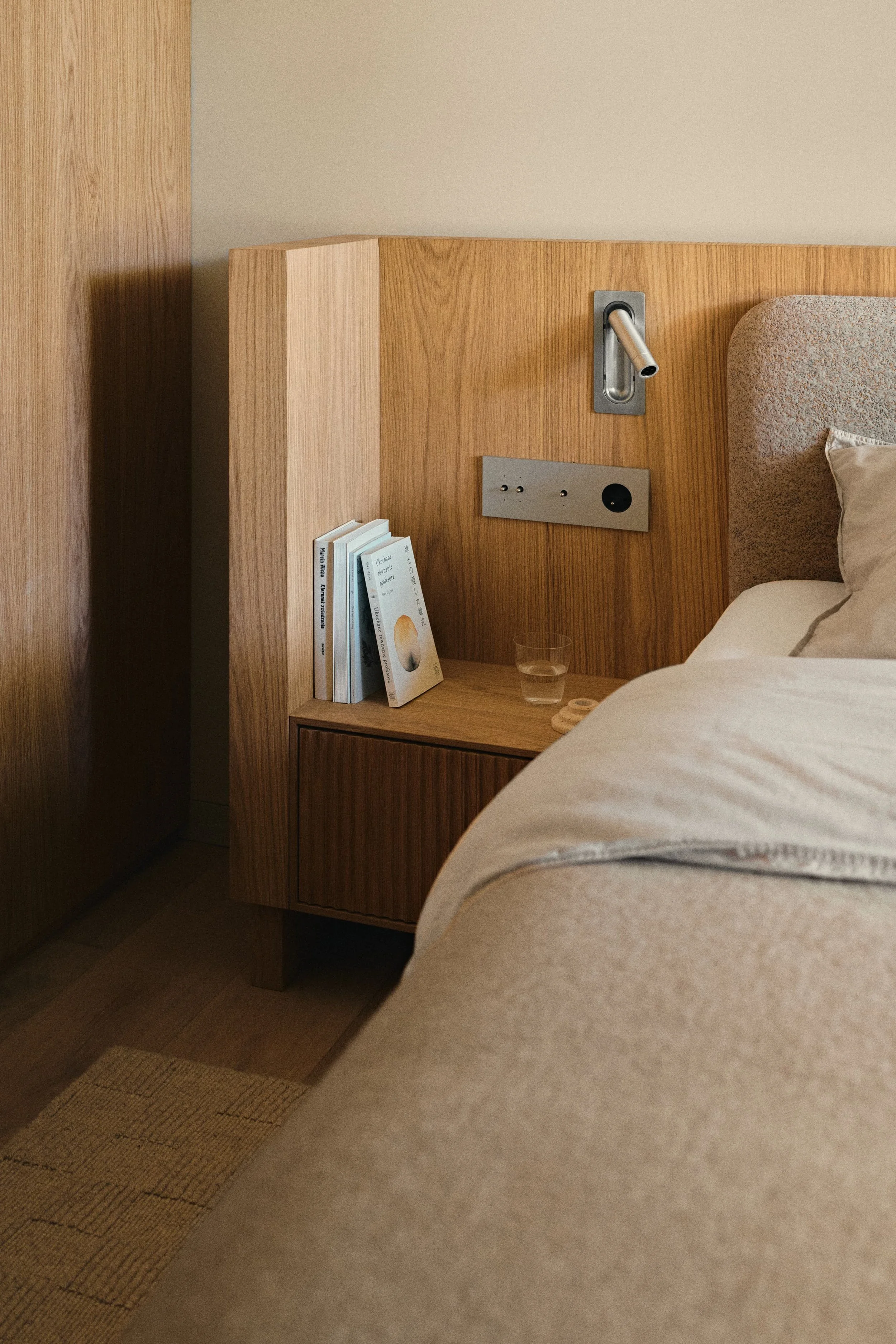 z myślą o maksymalnej funkcjonalności użytkowej. Dzięki powściągliwości w formie i detalach wnętrze zyskuje przestronność i płynne otwarcie na otaczający las sosnowy. Zabudowy meblowe oraz podłogi wykończone są jasnym dębem; elementy dekoracyjne wykonano z naturalnych materiałów — trawertynu, wełny