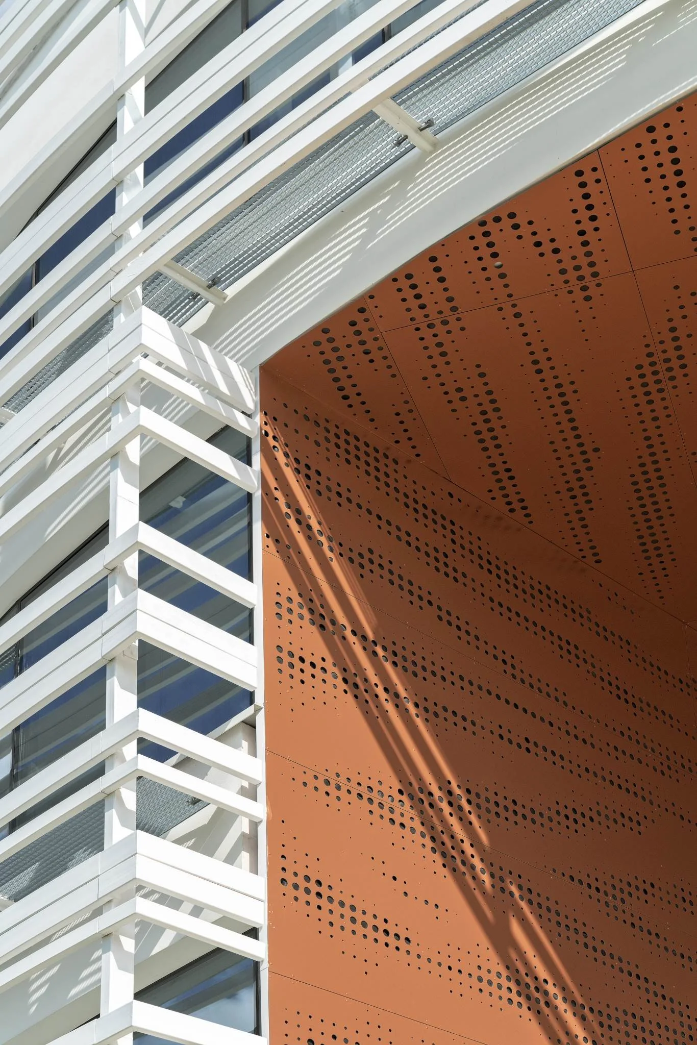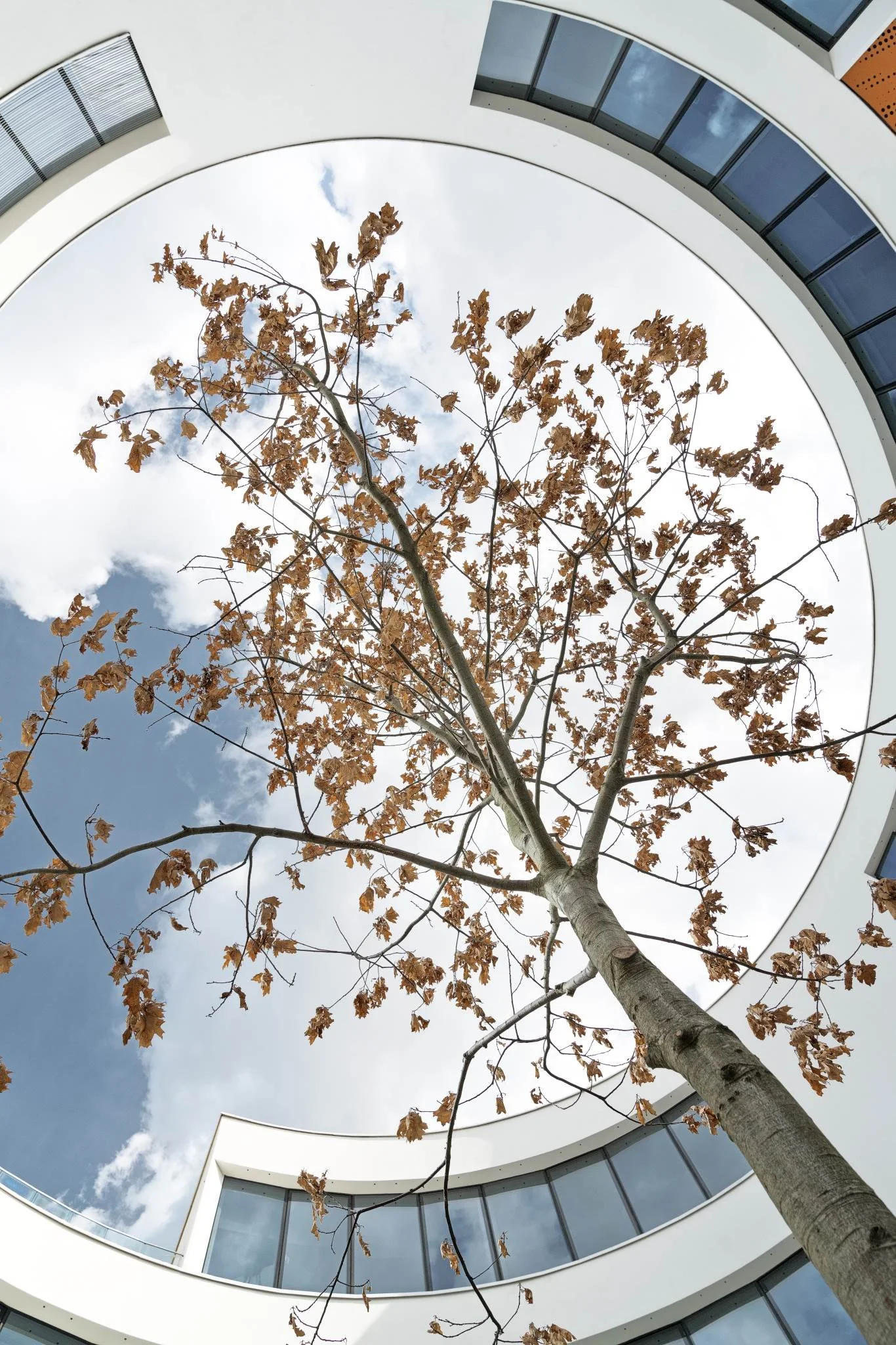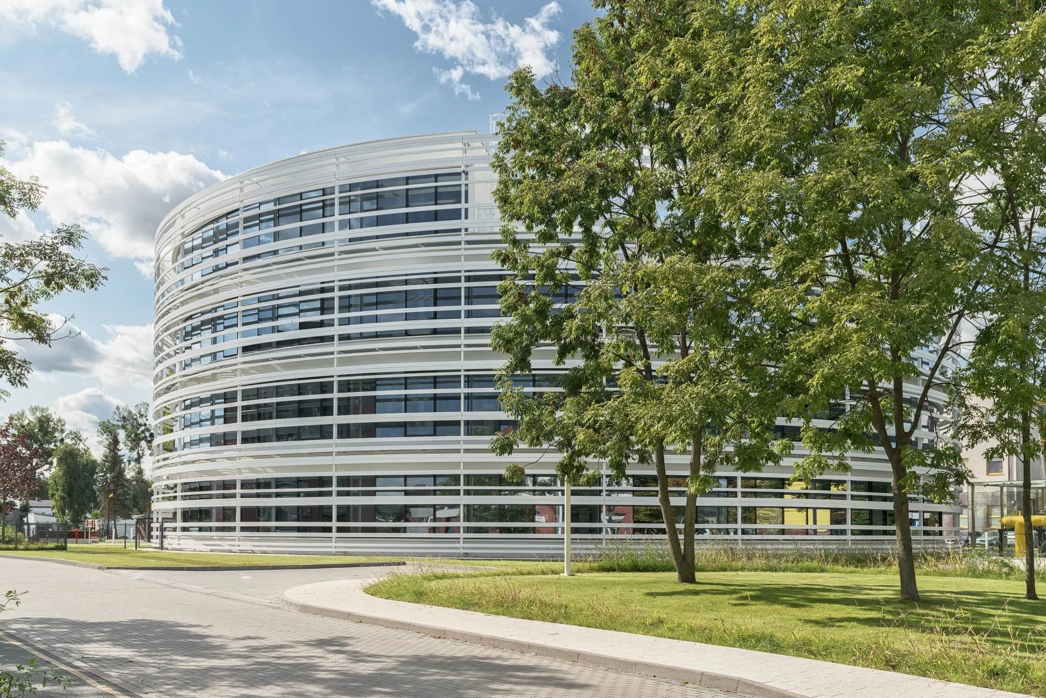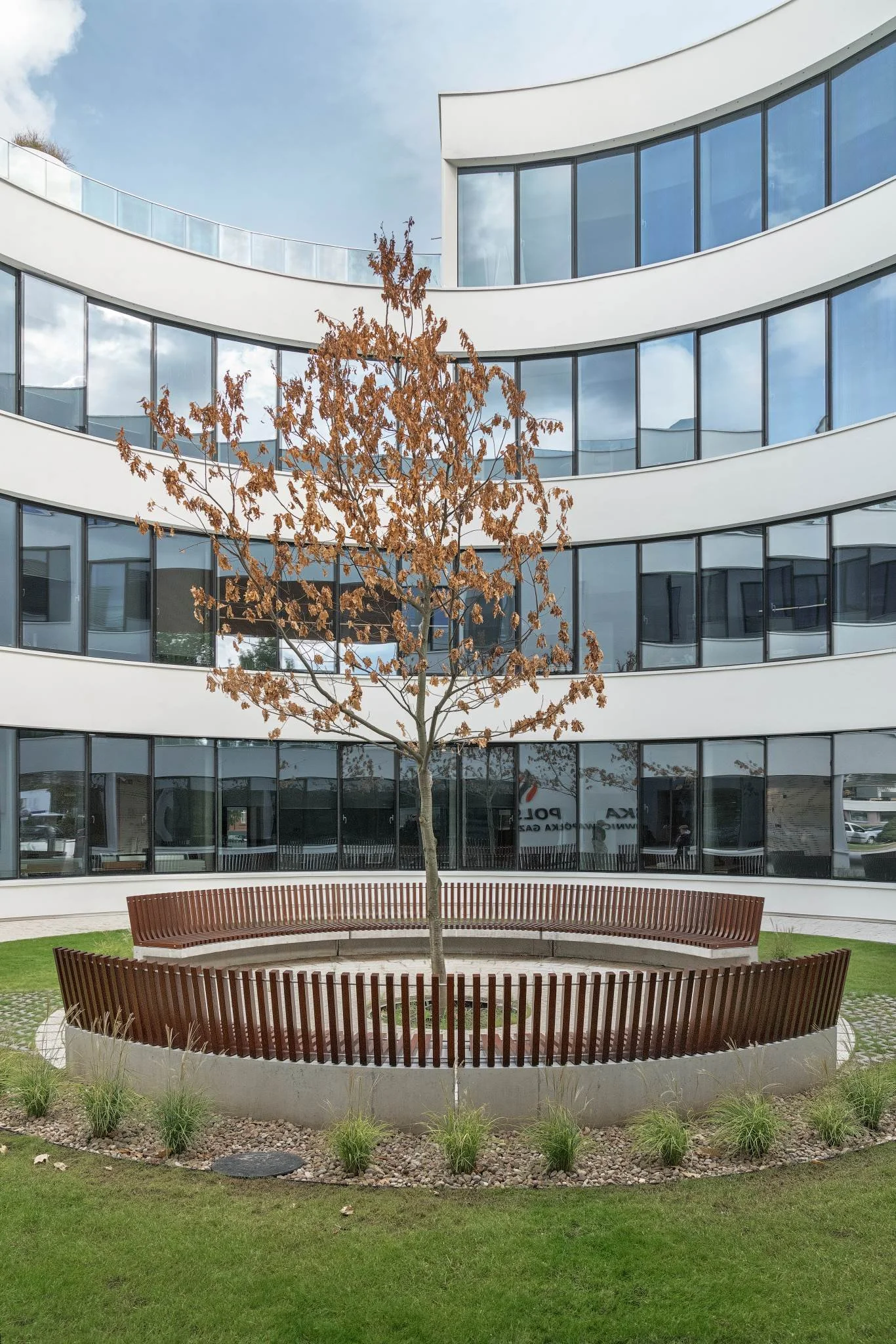 Użyto wysokiej jakości betonu architektonicznego, prace poprzedzone były precyzyjnymi rysunkami warsztatowymi poszczególnych szalowań w miejscach ekspozycji materiału, lokalnie zastosowano zmienną strukturę powierzchni poprzez młotkowanie. Poszczególne biura rozplanowane na planie koła tworzą jasny i czytelny układ powtarzalnych modułów, częściowo poprzecinany strefami wspólnymi.